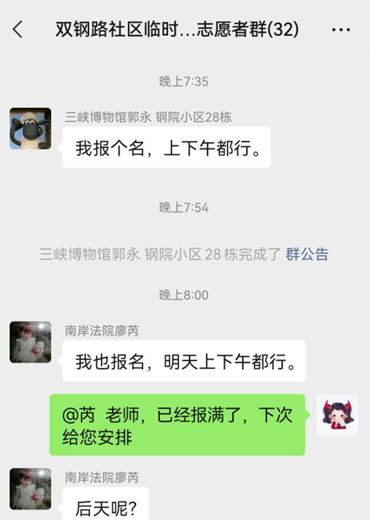 11月18日,雙鋼路社區被列為高風險地區,疫情防控形勢愈加嚴峻,為更好地服務社區居民,做好防疫工作,雙鋼路社區成立了志愿服務臨時黨支部,踏實肯干的李淑娟被推選為臨時黨支部書記。新的身份,新的使命,新的挑戰,李淑娟的戰場轉移到了管理志愿者團隊上,招募志愿者,協調安排每日工作內容成了李淑娟新的工作,“如今我們的臨時黨支部已經從最初的十余人壯大到了32人!笨粗諠u壯大的隊伍,李淑娟滿是欣慰。