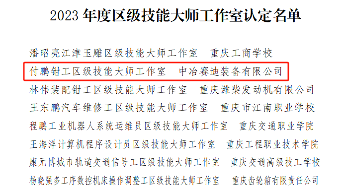 11月28日,中共重慶市江津區委組織部、江津區人力資源和社會保障局聯合下發《關于建立2023年度區級高技能人才培訓基地和區級技能大師工作室的通知》,以公司骨干員工付鵬命名的“付鵬鉗工區級技能大師工作室”成功獲評,同時賽迪裝備成功獲評江津區首批區級高技能人才培訓基地。值得一提的是,裝備公司是本次評選中同時獲批2個項目的企業。